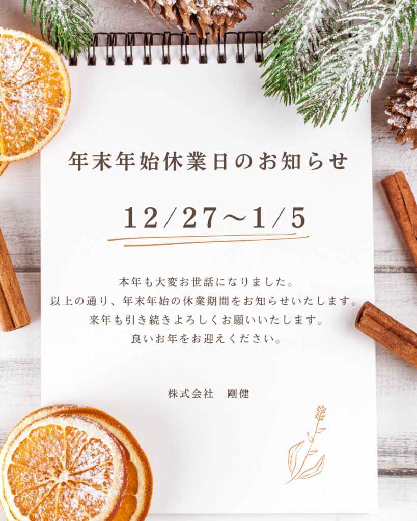 年末年始休業のお知らせ 更新日:2025.12.22 -年末年始休業のお知らせ- 本年も大変お世話になりました。 12月27日~1月5日までお休みとさせていただきます。 1月6日から通常通り営業となります。 来年も引き続きよろしくお願いいたします。 | ホームへ戻る |前の記事 >